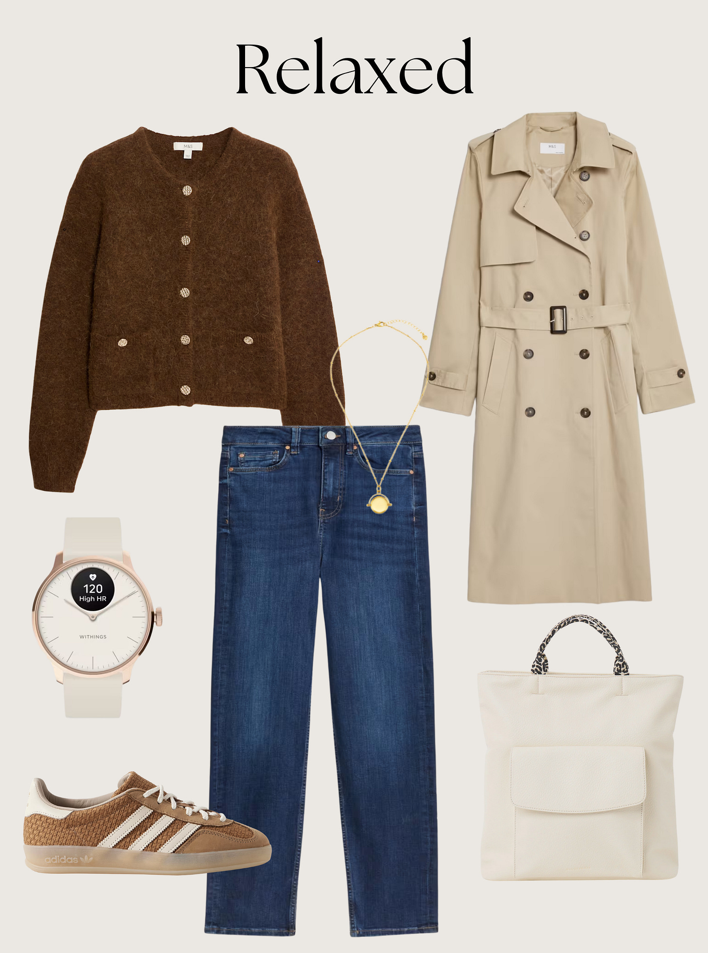 Easy, practical, stylish. The trench gives shape, the cosy cardigan adds a little bling, and super soft jeans keep you comfortable. Finish with sleek trainers so you can move at kid-speed but look grown-up chic.