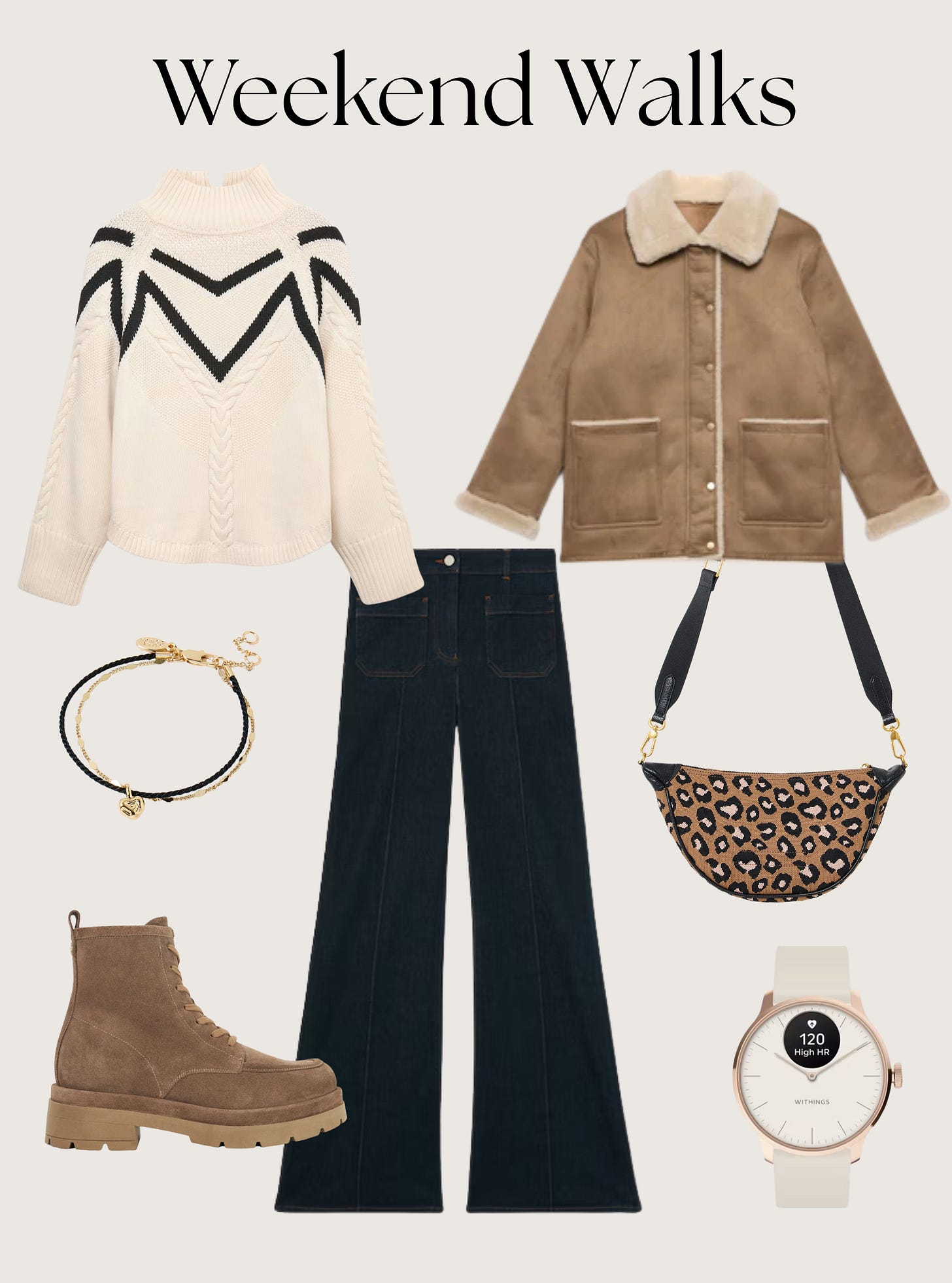 Cosy layers youβll actually look forward to putting on. A reversible lined jacket is lightweight but warm, a wool jumper adds luxe comfort, and wide legs to keep things comfortable; finished off with chunky boots and a stylish smart watch to count your steps.